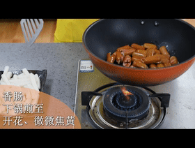 香腸下鍋煎至開花、微微焦黃,下年糕一起翻炒。