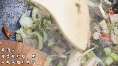 倒入入酸菜翻炒均勻、加入一勺白糖和半勺鹽翻炒入味即可