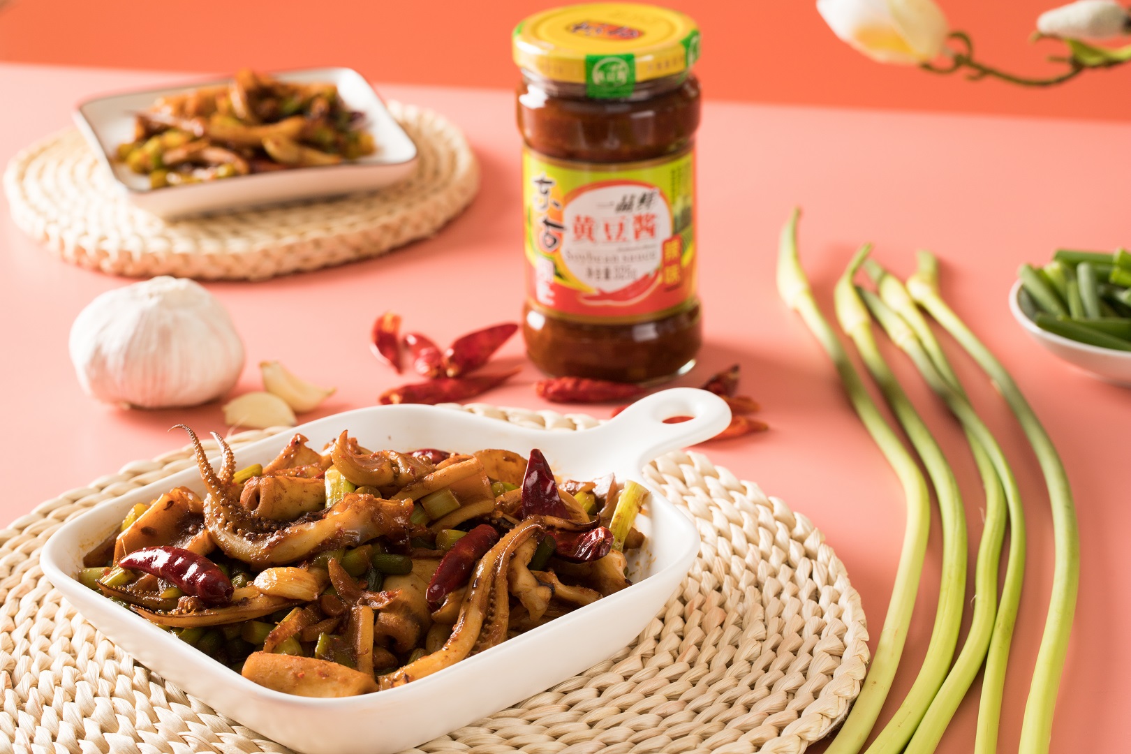 再倒入魷魚(yú),加入一勺辣椒面、一勺一品鮮醬油、一勺東古蠔油、一勺黃豆醬,翻炒均勻即可