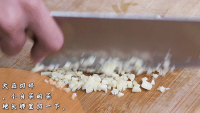 大蒜切碎,小白菜的菜梗頭那里切一下