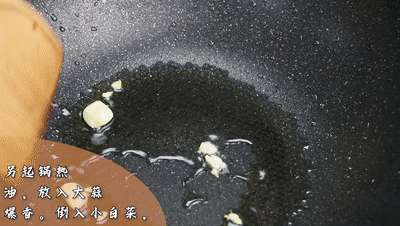 另起鍋熱油,放入大蒜爆香。倒入小白菜,加入一勺鹽炒出水,撈出控水備用.