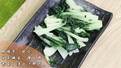 拿一個(gè)碟子,把小白菜鋪底,擺上荷包蛋,澆上汁即可