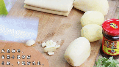 大蒜拍碎、香菜小蔥都切小粒、千張切長(zhǎng)條