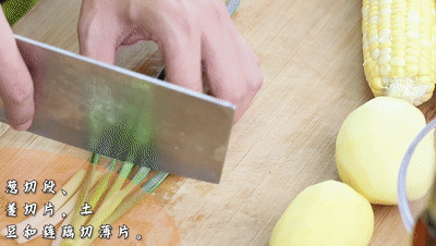 蔥切段、姜切片,土豆和蓮藕切薄片,西蘭花切中小塊、玉米對(duì)半折斷、再砍成四長(zhǎng)段