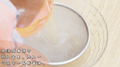 熬好的雞湯撈出湯渣,再隔著篩子倒入盆里。加入一勺東古一品鮮醬油、一勺東古蠔油、一勺紅油辣椒醬(喜歡吃辣的可以多放點(diǎn))攪拌均勻