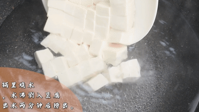 鍋里燒水,水沸倒入豆腐出水兩分鐘