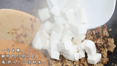 倒入豆腐加入一勺淀粉水,蓋上蓋子燜三分鐘