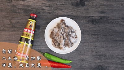 八爪魚焯水一分鐘,加入姜蔥料酒去腥