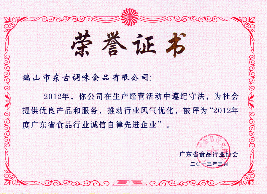 2012年度廣東省食品行業(yè)誠信自律先進企業(yè)證書