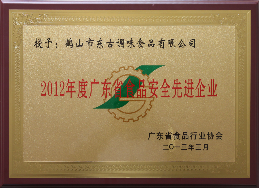 2012年廣東省食品安全先進企業(yè)牌匾