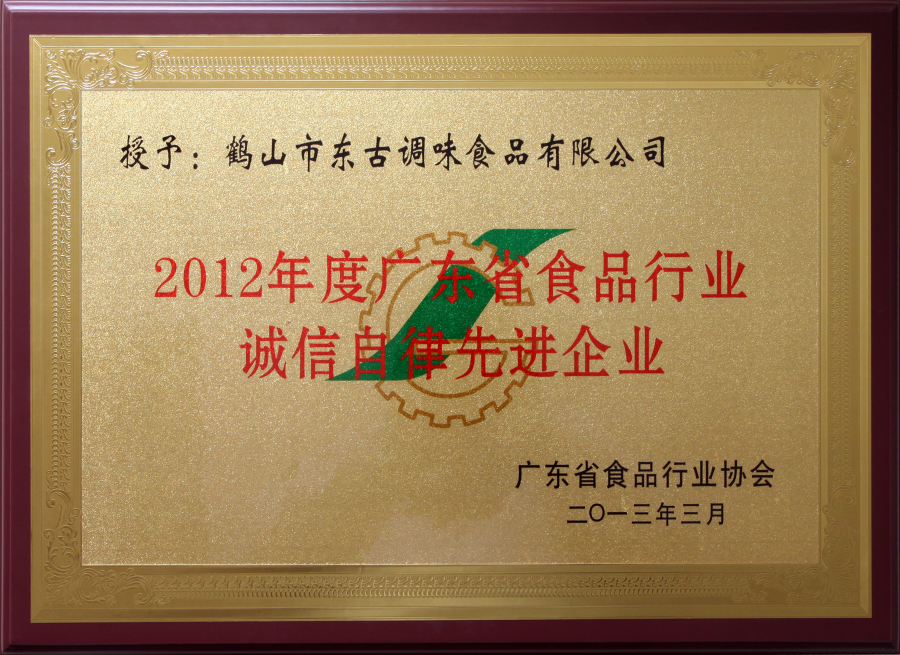 2012年廣東省食品行業(yè)誠信自律先進企業(yè)牌匾