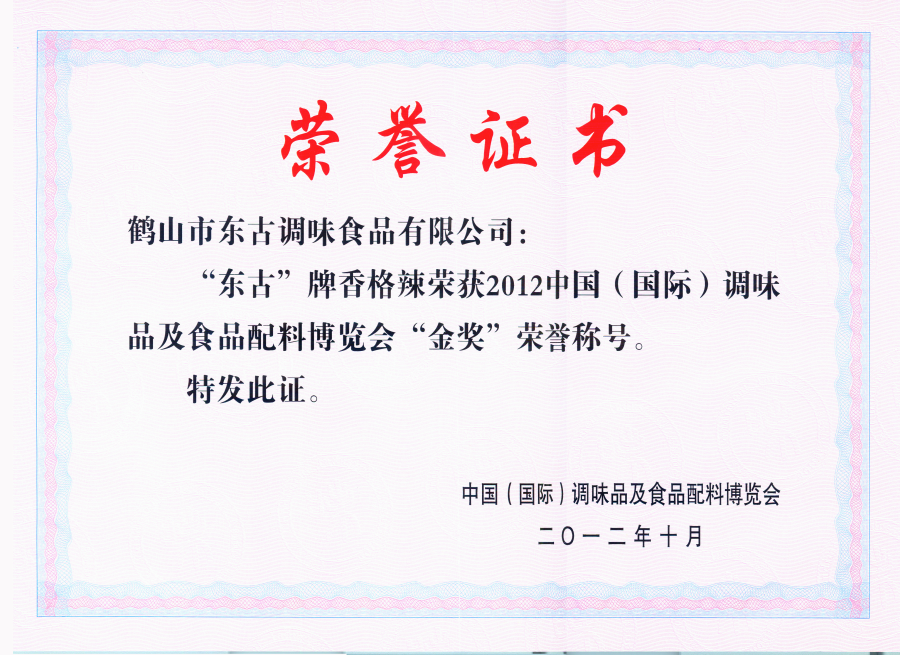 2012香格辣調(diào)味品及食品配料博覽會金獎證書